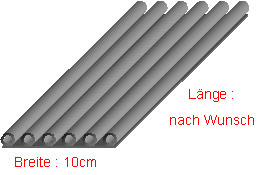 einfach geht´s : Der EPDM - Absorber wird in Streifen von 10 cmBreite auf Rolle geliefert. Die nötige Länge bestimmenSie selbst - nach der zur Verfügung stehenden Fläche. Alle Formen sind möglich, selbst Dreieck oder Trapez.Nachdem alle Streifen auf Länge geschnitten sind,werden sie nebeneinander ausgelegt und fixiert. Dies geschieht durch Kleben, Binden oderKlammern - schnell und einfach. Wir haltenfür jeden Untergrund das passende Befestigungsmaterial für Sie bereit. Weiter |
